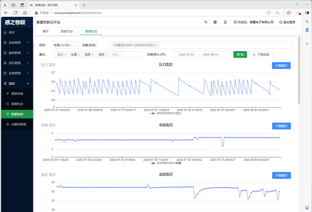 压力、温度、湿度、倾角四位一体,4G无线通讯配套物联网监控平台,实现设备压力、环境温度、湿度,设备姿态(三轴倾角)的同时测量;内置锂电池供电,电池寿命≥3年(@采集频率4小时/次),产品寿命≥100万次;通过第三方检测机构认证,佛山市普量电子有限公司享有多项专利。