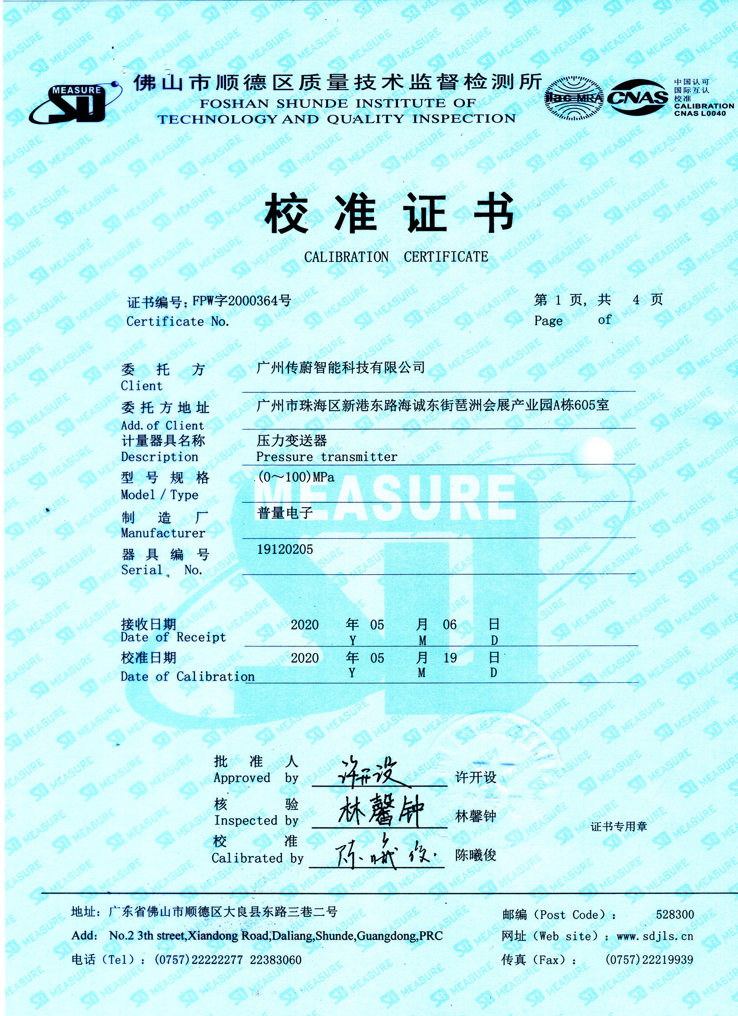 佛山计量局压力变送器检定证书